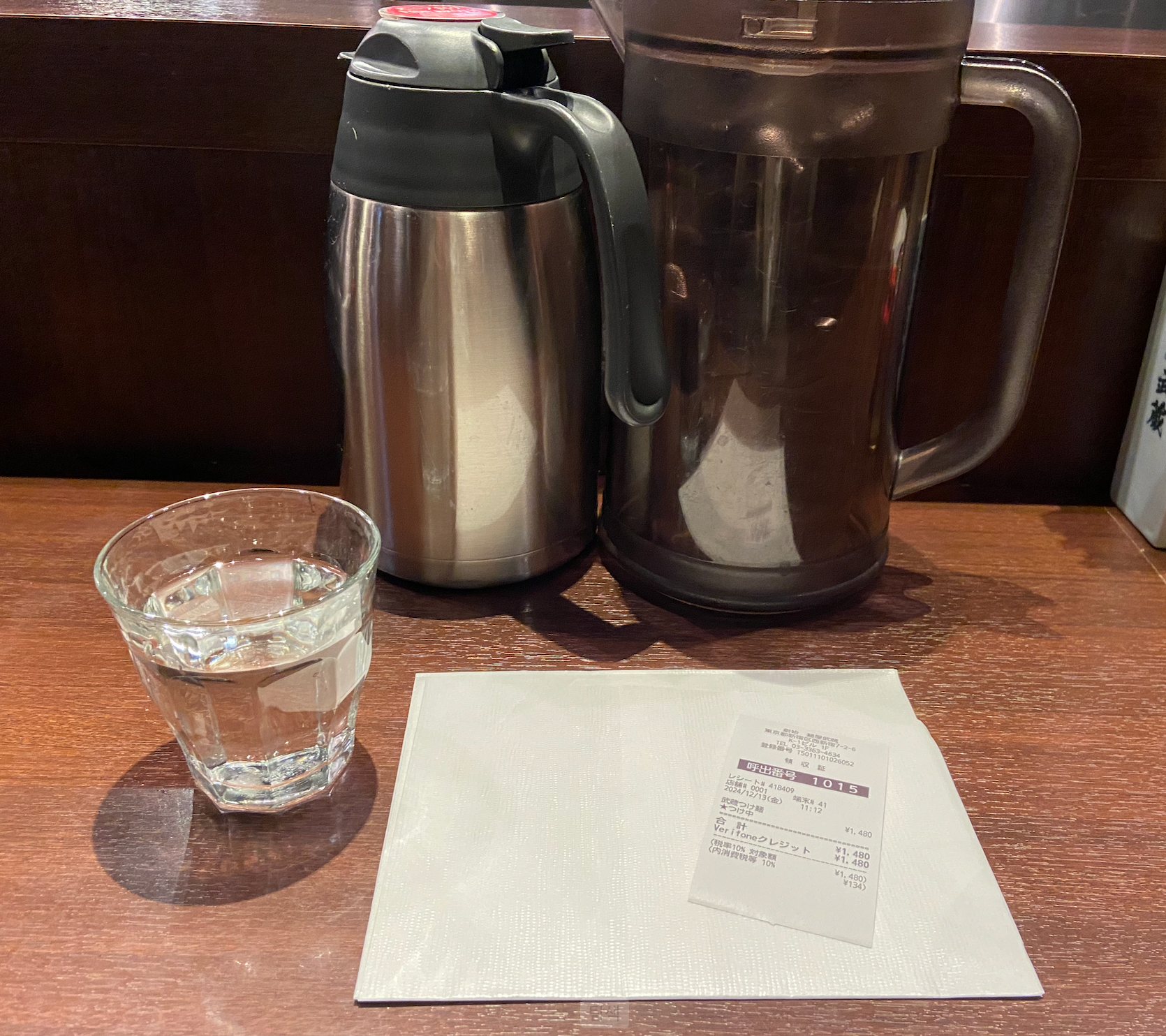 들어가면서 키오스크에서 주문을 하는 시스템이었구요, ㄱ자 테이블로 약 20명 정도? 앉을 수 있는 자리였어요. 다행히 저는 바로 앉았습니다 :) 키오스크 옆에는 일회용 앞치마가 있구요, 자리에 앉으면 물 한잔을 바로 내어주십니다.