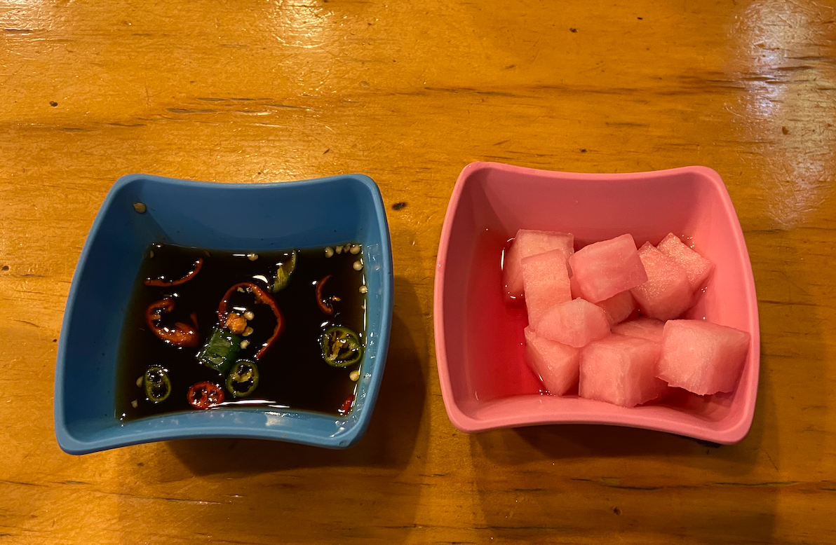 조금 있으면 소스와 치킨무를 내어 주시는데, 소스는 파닭을 시켜서 준건지 원래도 주시는지는 잘 모르겠어요.